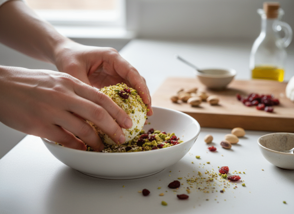 - Coat & Serve: On a plate, combine the remaining 1/4 cup chopped dried cranberries, 1/4 cup chopped pistachios, and fresh rosemary (if using). Unwrap the chilled cheese ball and roll it gently in the coating mixture until completely covered. Serve immediately with crackers and fresh fruit.