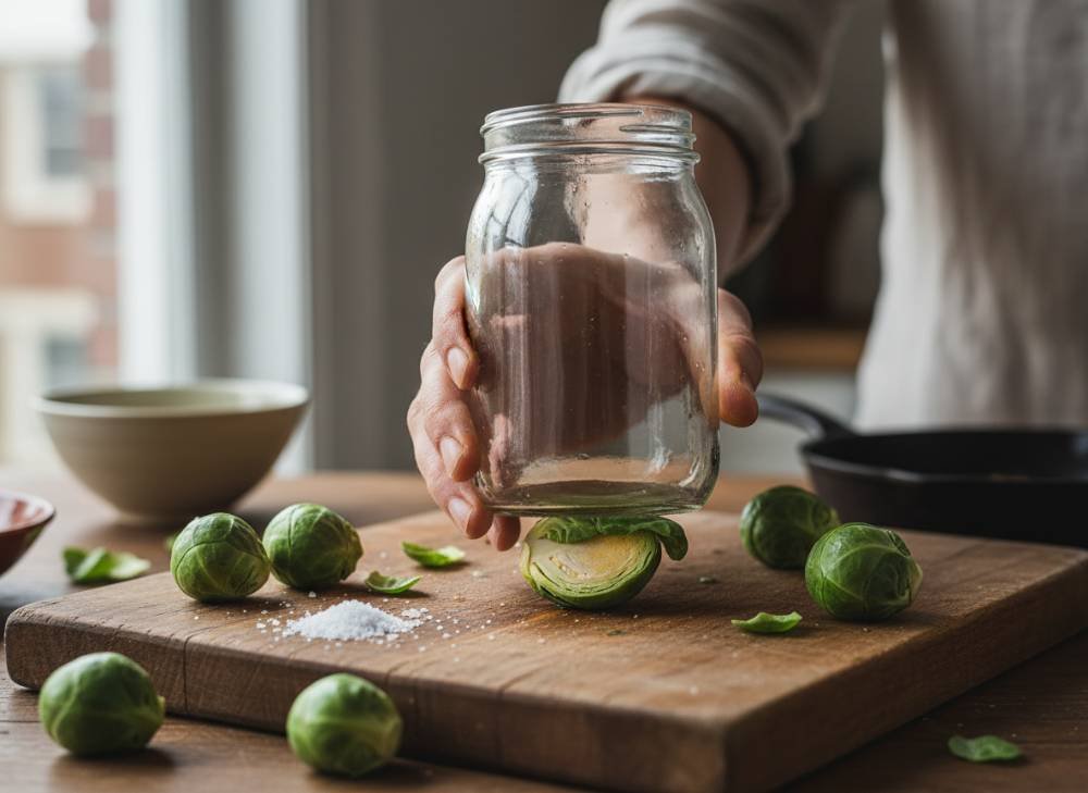 - The Smash: Pat the sprouts bone-dry. Place them on a flat surface and use the bottom of a heavy glass or a mason jar to gently press down until they are about 1/2 inch thick.