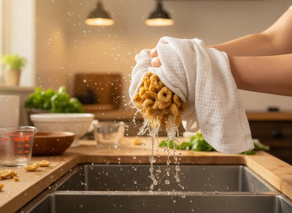- The Big Squeeze: This is the most important step. Once hydrated, you must squeeze every possible drop of liquid out of the soy curls. If they are too wet, they will steam in the air fryer instead of crisping. We recommend using a clean kitchen towel to wring them out until they feel “meaty” and dry to the touch.