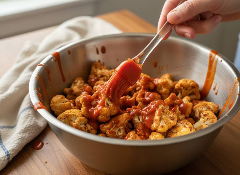 5. The Sauce Toss: While the cauliflower is cooking, whisk together your melted vegan butter and hot sauce. Once the florets are golden and firm, transfer them to a bowl and toss them gently with the sauce.